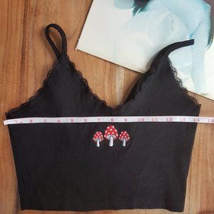 Crafted from high-quality materials and designed with style in mind, this crop top is the perfect addition to any streetwear enthusiast's wardrobe. The ribbed texture with lace trim adds a touch of sophistication, while the playful mushroom design makes it a fun and unique statement piece.