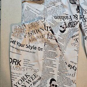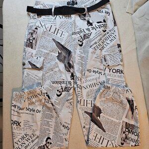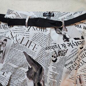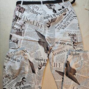 Fashion Graphic Newspaper Print cargo pants. Wide leg with elastic cuff. Black cloth belt.