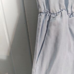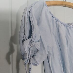 Streetwear Society blue chambray romper with elastic along neckline and waist.