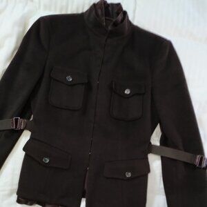 This jacket is truly stunning! Gabriele Strehl, one of Germany's most successful fashion designers, turned Strenesse into an international luxury brand. This striking and unique dark chocolate brown wool-cashmere safari-style jacket features: silk ruffle around the front, neck, hem, and sleeves; breast and hip patch pockets with button flaps; front dressmaker hook closure; running stitch top-stitching; and shoulder pads. The luxurious 85% wool /15% cashmere fabric is soft and almost plush. Top-quality viscose-acetate lining with Strenesse logo. Matching leather belt with metal hardware.