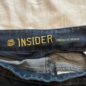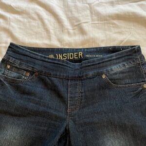 For your consideration is a Preloved nice clean condition pair of stretch denim pull on pedal pushers. These are shorter than capris, and I have them cuffed, I wore them at my knee. Brand is insider premium denim. 70% cotton 28% polyester 2% spandex size 28. Very cute, thanks for looking!
