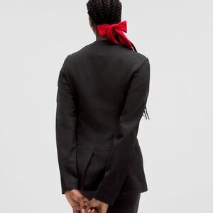 Power move. This collarless knit blazer has a sculpted silhouette that owns the boardroom and, well, every room you walk into. Color is Black. Size M.