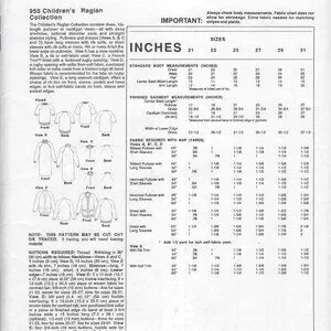This is vintage 1986 Ann Person Stretch & Sew Pattern #955 for Children's Raglan Collection - one pattern many looks for chest sizes 21, 23, 25, 27, 29, 31. The pattern pieces are uncut and factory folded. Instructions are written for sewing machines and sergers. Pattern may be cut out or traced.