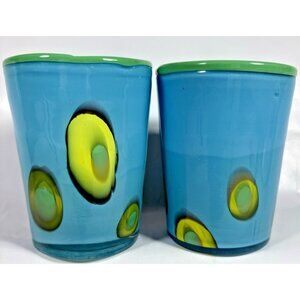 Stretched Abstract Milliefiori Green Modern Art Blown Teal Glass Drinking Pair.