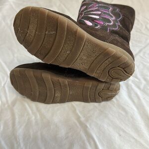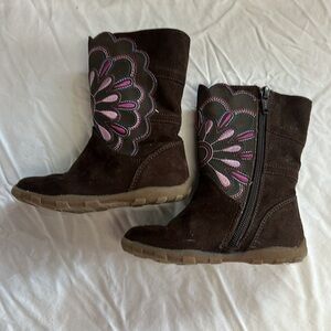 These mid-calf boots showcase a delightful floral design in pink on a soft brown suede-like material. With a rounded toe and pull-on style, they offer both comfort and style for any occasion. Side zipper closure for easy dressing.