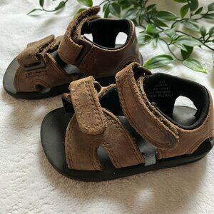 stride rite toddler sandals, leather toddler shoes, brown baby sandals, boys sandals size 5, girls sandals size 5, summer toddler shoes, pre-loved toddler footwear, adjustable strap baby sandals, comfy leather baby sandals, unisex toddler sandals