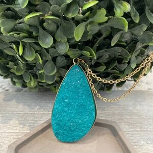 Beautifully handcrafted in Canada, this striking large druzy pendant features a vibrant turquoise hue with a shimmering textured surface. Set in a gold-tone frame and paired with a stylish chain, this statement piece adds a bold and elegant touch to any outfit. Perfect for layering or wearing solo!