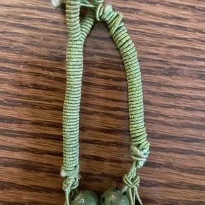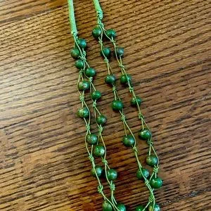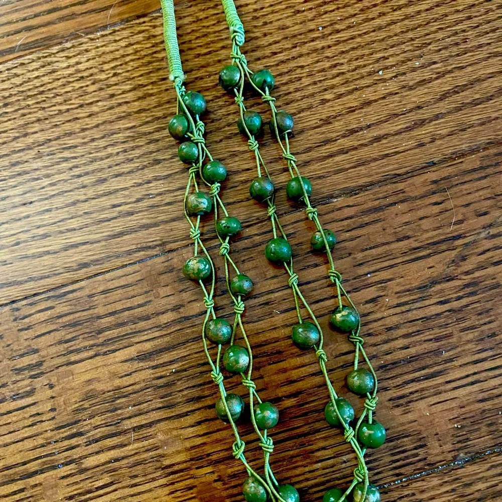 Unique, stylish green beaded necklace. Hand made. Great quality. Excellent condition. Tightly woven closure bands with pull through bead. Beads are green with a hint of gold. Never worn.