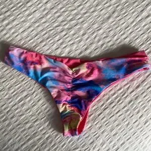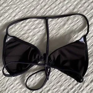 String bikini with reversible ruched cheeky bottoms and two tops. A black t back with a tie in the front and a white clam shell traditional string tie top. White top does not have inserts in the design, some pilling (see last photo).