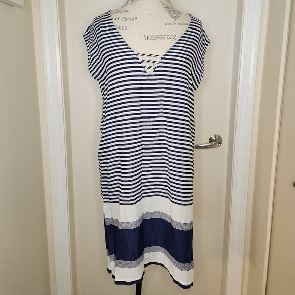Lightweight Blue & white Contrast Stripes Sleeveless Swim Cover Kaftan Dress with Deep Vneck, by Azura Australia.