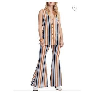 2 piece set, light weight, wife leg pants with slits on the side of each leg (pants fit big), low v- neck vest top with big brown buttons