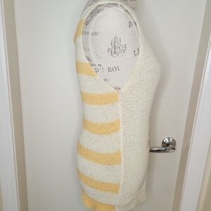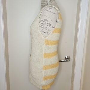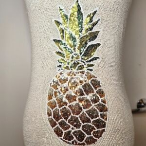 Cream with orange stripes up the back crepe knit sleeveless scoop neck tank top with large copper silver & green sequin pineapple decal front, by The Classic.