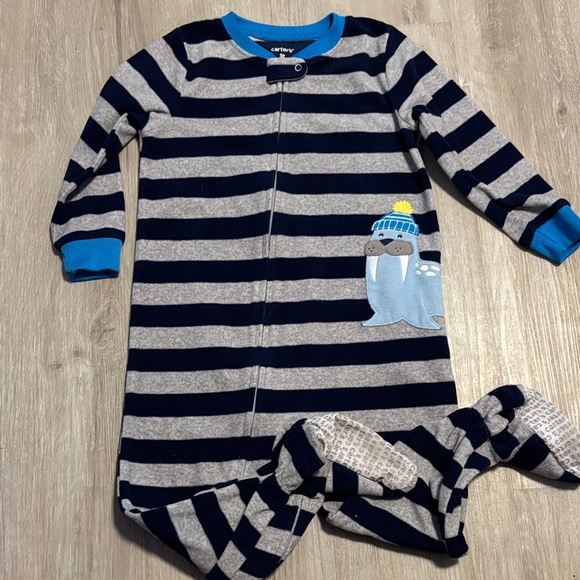 Adorable striped baby sleeper featuring a cute walrus design. Perfect for cozy nights.