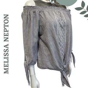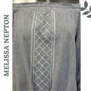 Breezy and feminine, this off-the-shoulder blouse by Melissa Nepton is a summer-ready favorite. Crafted from a lightweight striped fabric, it features elegant embroidered detailing down the front, a tie-front hem, and knotted sleeve cuffs. The elastic neckline keeps the silhouette secure and flattering, making it perfect for warm days or sunset dinners.