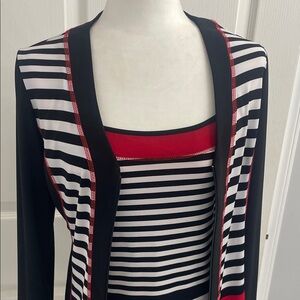 Michael Tyler twin set jacket & cami. White, Black and Red stripped. Features bold stripes and a classic design. This woman's dress fashionable is made in Canada and is ready to wear. perfect for many occasions, office, date night and easy to pack for vacations. Does not wrinkle. In EUC, shows no signs of wear.