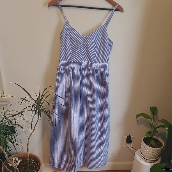 Embrace summer with this chic striped blue maxi dress. Dress it up with a blazer or pair it with a cute cardigan for a summer evening on the boardwalk. It even has pockets! The care tag is missing, but it feels like 100%cotton.