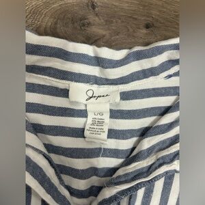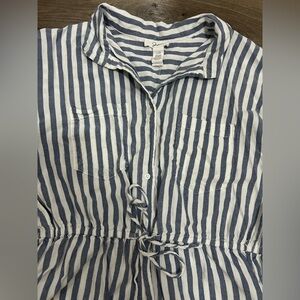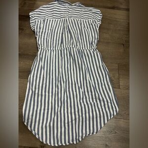 Chic button-down dress with blue and white stripes. Features short sleeves and a tie waist. Perfect for casual wear.