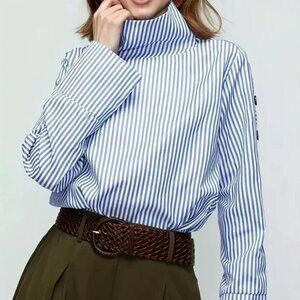 Striped Button Detail Sleeve Turtleneck Blouse