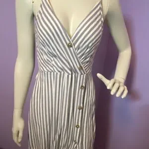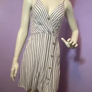 White and blue striped dress with button-down front. New without tags Features a flattering wrap design and thin straps. Comfortable fit perfect for spring and summer