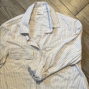 White and gray striped button-up shirt with long sleeves and chest pockets. Beautiful beach lunch lounge collection size small. Where the sleeves full length or 3/4 for the spring and summer months styles well with anything