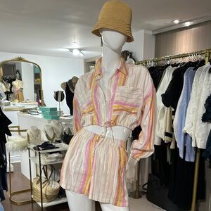 Stylish striped button-up shirt and shorts set. Features pink, orange, and cream stripes. Perfect for a casual day out.