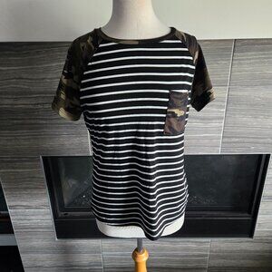 Striped & Camo Contrast Tee – Women’s Size Medium (Great Condition)