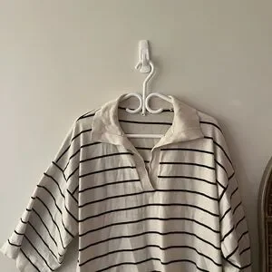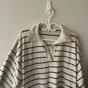 Stylish striped sweater with a unique collar. Perfect for casual wear. Soft and comfortable fabric. Oversize style