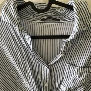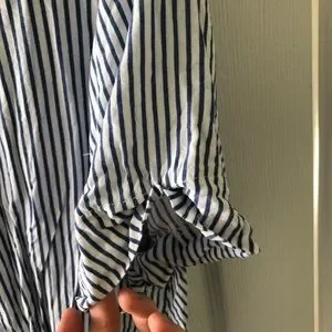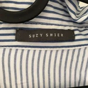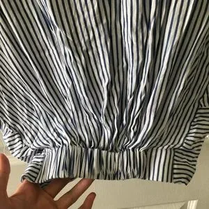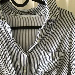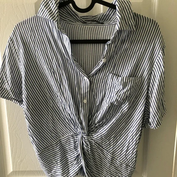 Very cute and summery crop top from Suzy Shier! The blue and white stripes are super cute and flattering, and they give the shirt and very sailor-like vibe! The shirt has buttons on the from, a collar, and sleeves that are tapered so they fit closer to the arms. The bottom of the top has a knitted look at the front, and it cinched in the back, for style but also to help keep the top in place. The shirt hits about mid abdomen on me (5’8”, 130lbs), but it would likely hit lower on the belly for someone a bit smaller than me! If you need specific measurements, please let me know! I’m also always open to offers!