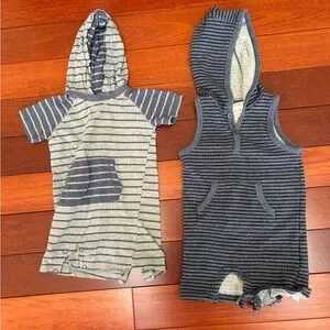 Set of two striped hooded baby rompers. Features short sleeves and sleeveless designs. Perfect for casual wear. Preloved, size 18-24 months.