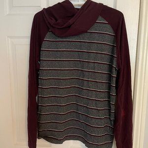 Grey shirt with burgundy long sleeves, hood and chest pocket, with burgundy and white stripes.