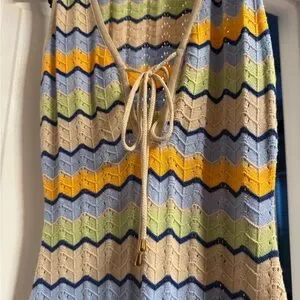 This stylish maxi dress features a vibrant striped pattern in blue, yellow, and cream. Perfect for any occasion, it offers a comfortable and chic look.