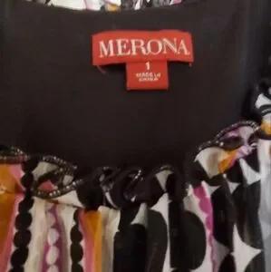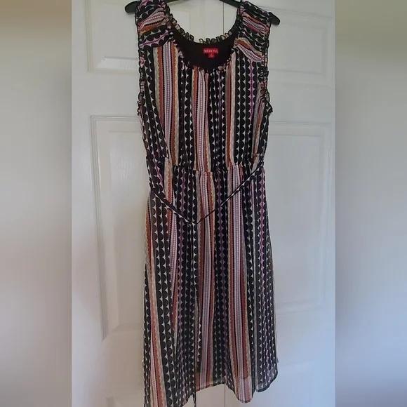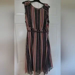 Stylish dress with multicolor stripes. Features a mix of black, pink, and orange hues. Perfect for any occasion. New, no labels. Lined and has belt. Pretty for the Summer.