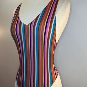 Dive into style with this vibrant striped one piece swimsuit. Featuring a stunning array of colors, this swimsuit is perfect for making a splash at the beach or pool. Enjoy a comfortable fit and eye-catching design.