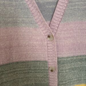 Stay cozy and stylish with this striped multicolor cardigan sweater. Featuring shades of pink, gray, and yellow, this sweater is perfect for layering. Enjoy the comfort and warmth it brings to your wardrobe.