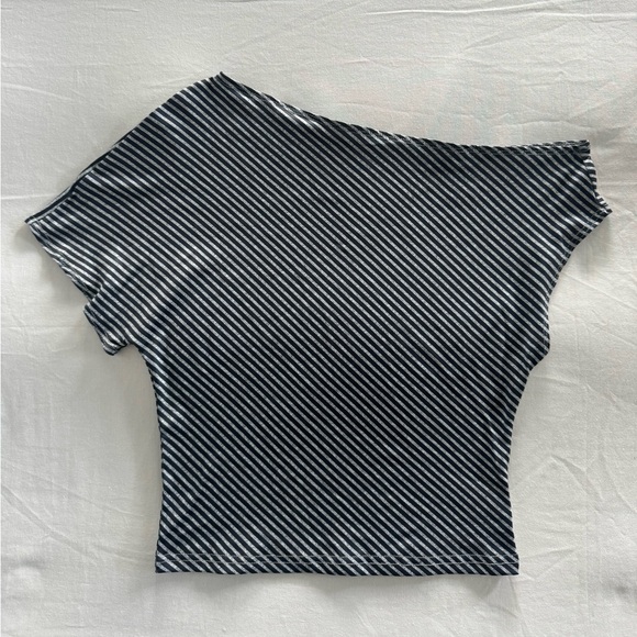 Stylish asymmetrical off-shoulder top with black and white stripes. New and perfect for casual outings.
