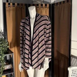 Stylish striped open front cardigan with navy stripes. This sweater has no pockets or buttons and sleeves are 3/4 length. This is a great piece for layering. It has tiny sparkles throughout that can’t be seen in the photos.