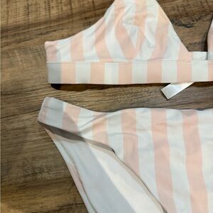 Stylish and comfortable, this striped bikini set features a peach and white design. Perfect for a day at the beach or pool.