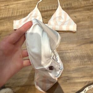 Stylish and comfortable, this striped bikini set features a peach and white design. Perfect for a day at the beach or pool.