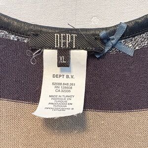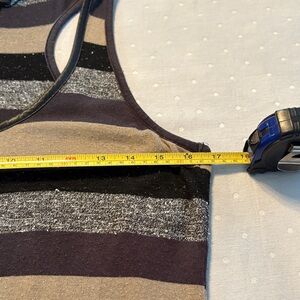 Stylish striped racerback tank top perfect for casual outings. Features a blend of gray, tan and black with gold flecks.