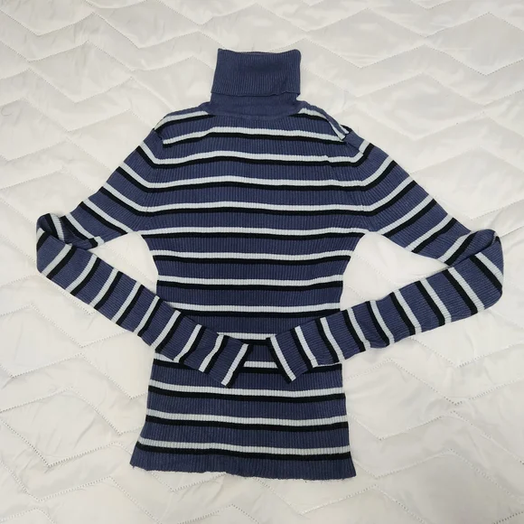 Stylish striped ribbed turtleneck top. Features navy and white stripes. Perfect for a cozy look. material is very stretchy allowing for a fitted style. Worn only a couple of times.