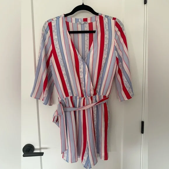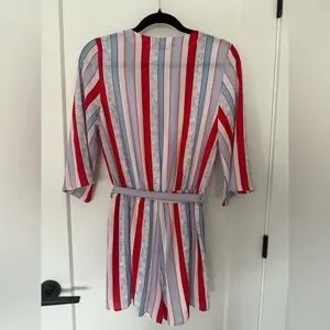 Romper with red, white, blue stripes and floral pattern. Features a tie waist and 3/4 sleeves. Dex Brand. Size XS (measured flat - unstretched waist: 12"; stretches comfortably up to 14"; pit-to-pit: 17"). Smoke-free and pet-free home.