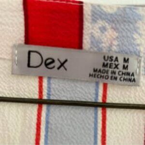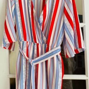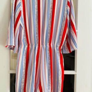 Super comfy romper with vertical red, white, blue and floral pattern stripes.