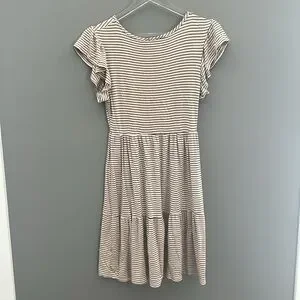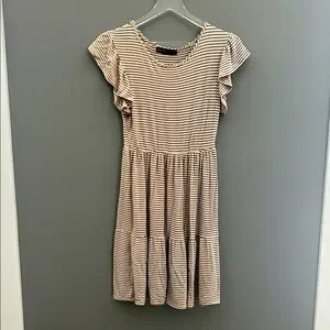 Chic striped dress with ruffle sleeves. Perfect for casual outings.