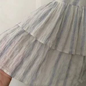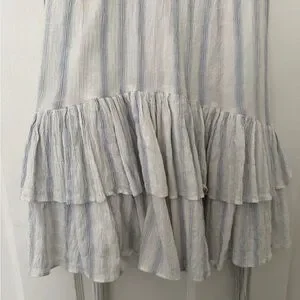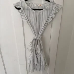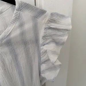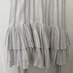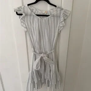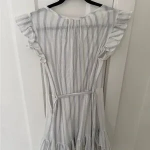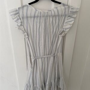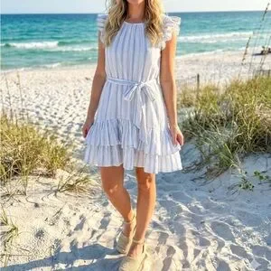 Embrace summer vibes with this elegant striped dress. Featuring ruffle sleeves and a flattering tie waist, it's perfect for any occasion. The light blue and white colors add a fresh touch to your wardrobe.