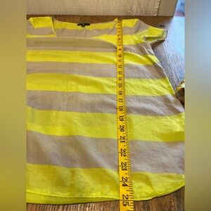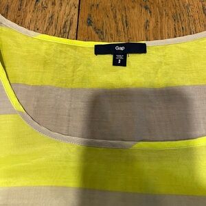 Short-sleeved semi-sheer blouse by GAP with fluorescent yellow and taupe horizontal stripes. Lightweight and breathable fabric made of 70% cotton and 30% silk. Scoop neckline, airy fit, slightly transparent—ideal for summer layering or relaxed outfits.