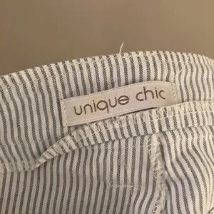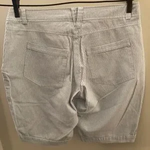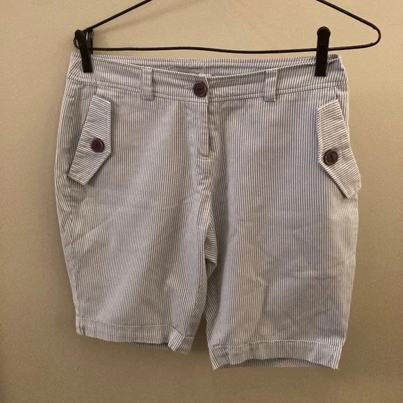 Vintage striped shorts. White and light blue. Mid waist, cargo style, above the knees length. Size 6 US / 10 UK.