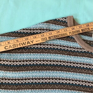 Northern Reflections 100% Acrylic. Blue and brown patterned sweater. Gorgeous colours. Size Medium. Sort of a slouchy/bat wing style (if that’s what you call it) sleeves. See photos for measurements.