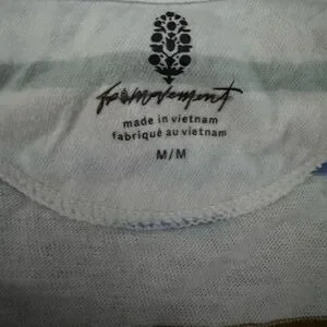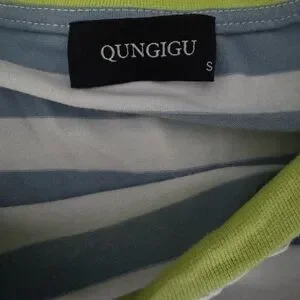 Set of two striped t-shirts. One features blue and white stripes with a green collar. The other has multicolored stripes on a white background. Both are a boxy oversized fit