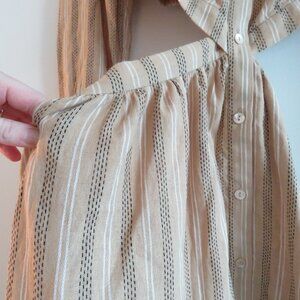 Elevate your style with this chic striped tan midi dress. Perfect for any occasion, this dress offers a blend of comfort and elegance.