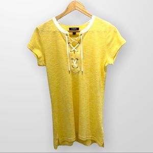 A classic striped print and a lace-up placket give this women's Chaps top a lovely look. New with tags. Yellow and white.